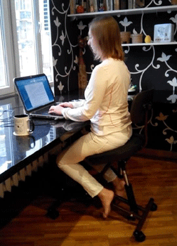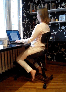 При звичайній посадці все навантаження припадає на нижню частину спини - ви можете відчути це піднявши лікті або зап'ястя зі столу і відірвавши стопи від підлоги. Це відбувається через неправильний згин тіла, коли вісь навантаження зміщується вперед, вам потрібно спиратися на зап'ястя, щоб компенсувати неправильне навантаження на спину. Посадка на  колінному ергономічному стільці  дозволяє перенести частину напруги з нижньої частини спини на коліна та стегна. Цьому сприяє положення тіла, що нагадує положення тіла у вершника.